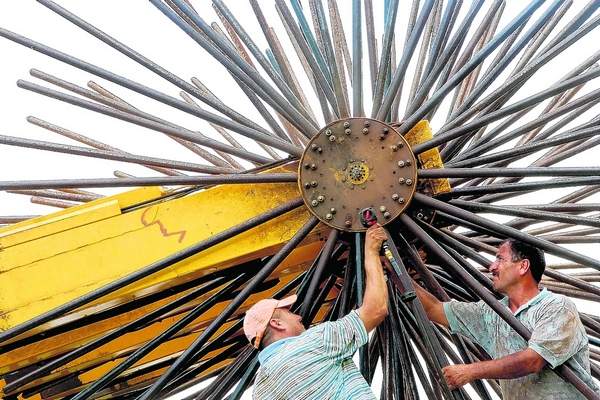 Jaime Cantu and Richard Leno work on one of two Oxbo citrus canopy shakers being used for research.