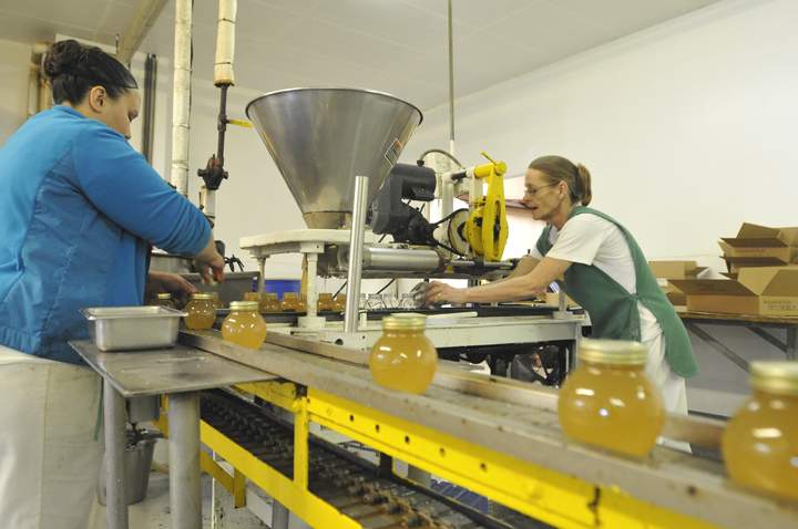 Sandra Hernandez, left, and Christine Harris make and pack jars of key lime jelly.