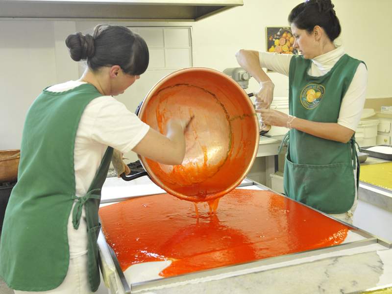 Tonya Copeland, left, and Olga Viggiano pour a fresh cooked batch of orange citrus delicacy out to cool.