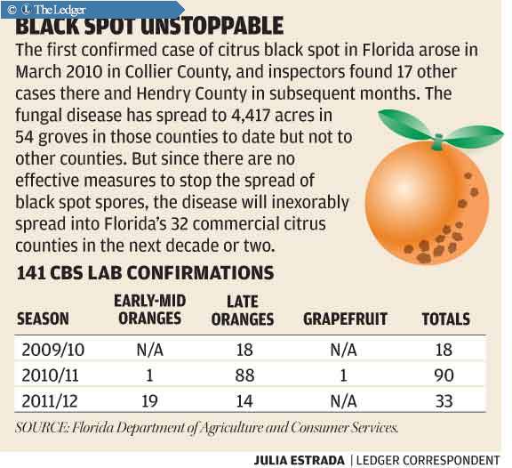 "Once the disease is established, it's there. There's no way to eradicate it," said Jim Snively, vice president for grove operations at Southern Gardens, who visited Brazil in January with Kress to study the disease. "Black spot is going to spread across Florida. It may take 20, 30 years. Who knows?"